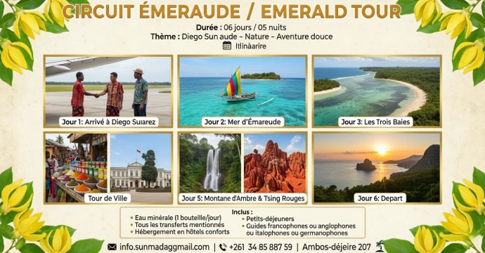 Profitez d’une aventure douce entre mer et nature : pirogue traditionnelle sur la Mer d’Émeraude, randonnée à la Montagne des Français, découverte des Trois Baies et détente sur la plage de Ramena